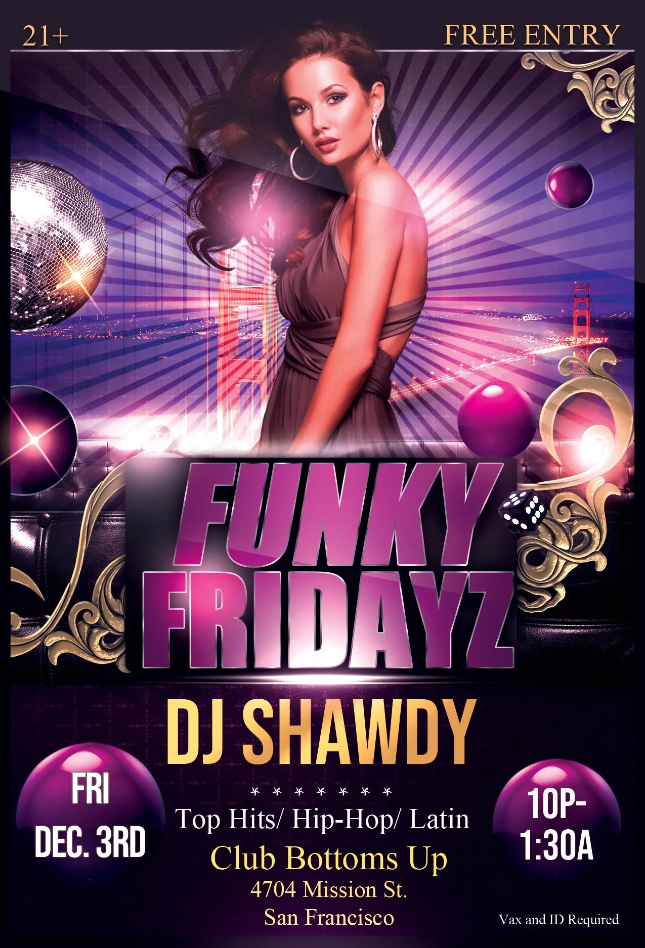 Dec 3 to Dec 4 FUNKY FRIDAYZ Fri, Dec 3, 2021 10:00 PM Sat, Dec 4, 2021 1:30 AM Google Calendar ICS Club Bottoms Up (4704 Mission St. San Francisco) FREE View Event →